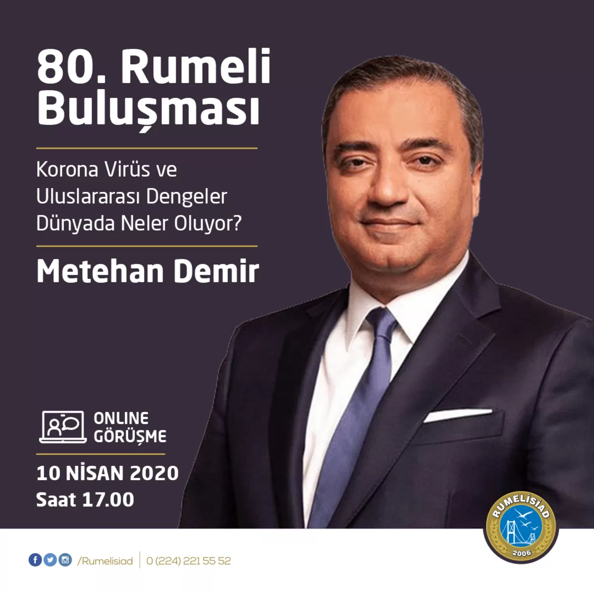 RUMELİSİAD 80. Rumeli Buluşmasında, Sn. Metehan Demir’i ağırlayarak, ülkemizin yaşadığı Covid-19 salgını Dünya genelindeki durumunu, Uluslararası Dengelerini ve Dünya’da neler oluyor konularını Video Konferans üzerinden değerlendirdik.