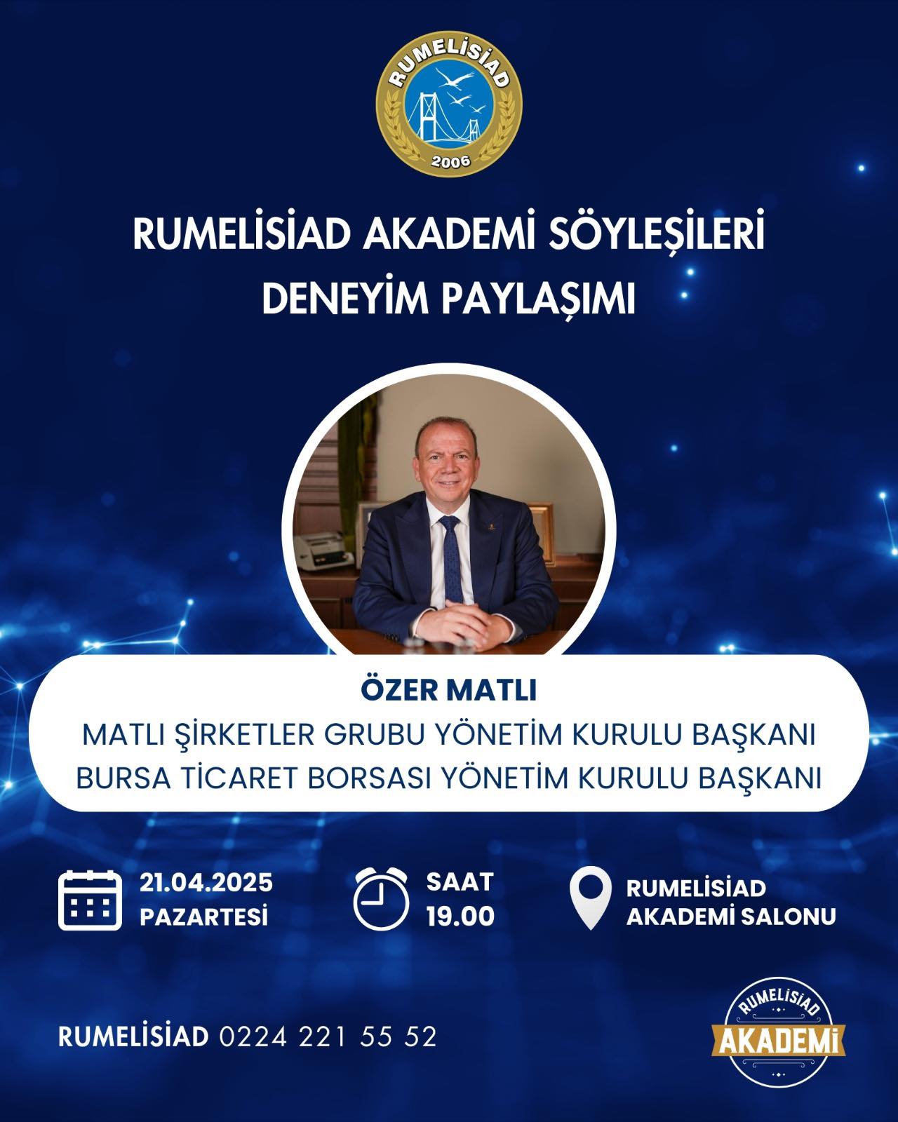 İş dünyasının önde gelen isimlerinden Özer Matlı, deneyimlerini paylaşmak üzere bizlerle buluşuyor. 21 Nisan 2025 Pazartesi günü saat 19.00’da Rumelisiad Akademi salonunda gerçekleşecek olan etkinliğimizde, Matlı Şirketler Grubu Yönetim Kurulu Başkanı ve Bursa Ticaret Borsası Yönetim Kurulu Başkanı olan Sayın Özer Matlı, iş hayatındaki yolculuğunu, kurumsal vizyonunu ve çok sektörlü yatırım tecrübelerini anlatacak. Tarım, gıda, sanayi, enerji, lojistik ve daha birçok alanda önemli başarılara imza atan Sayın Matlı’nın değerli paylaşımlarını dinlemek üzere etkinliğimize davetlisiniz.