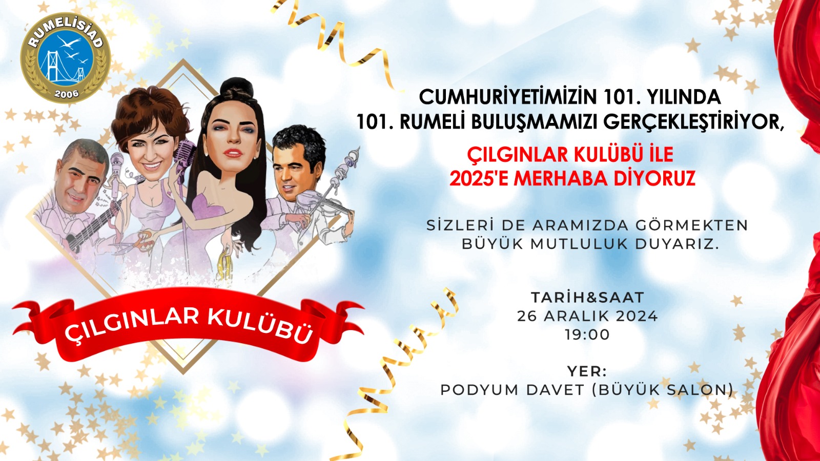 Cumhuriyetimizin 101. Yılında 101. Rumeli Buluşmamızı gerçekleştiriyor Çılgınlar Kulübü ile 2025'e merhaba diyoruz. Sizleri de aramızda görmekten mutluluk duyarız.